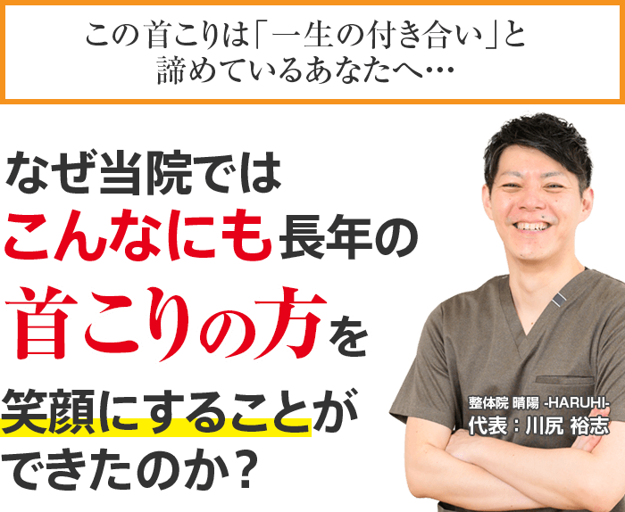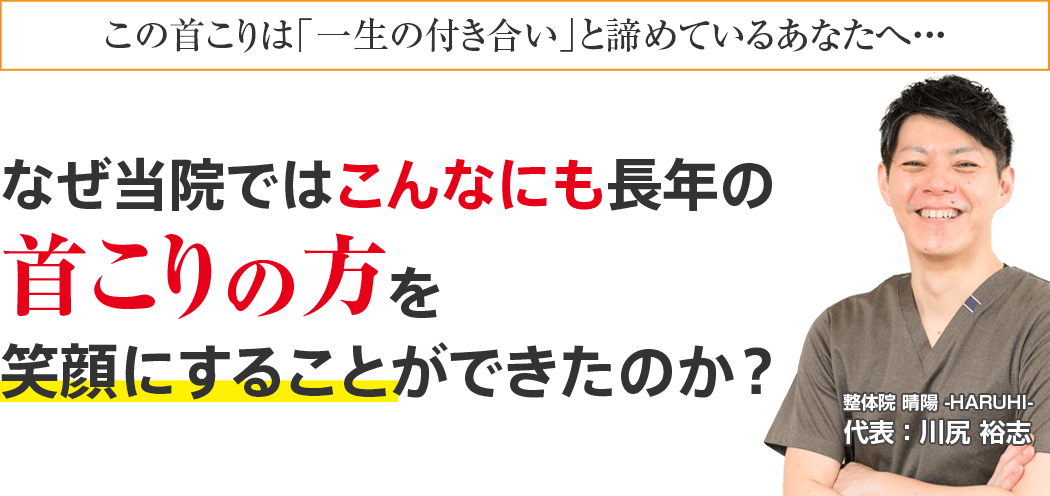もしあなたが今、上記のようなお悩みがあり、ほんの少しでも心のどこかで良くなりたい!と思われているなら、整体院 晴陽-HARUHI-に来院し、そのつらい首こりを根本から改善しませんか?私が必ず、あなたの力になってみせます。